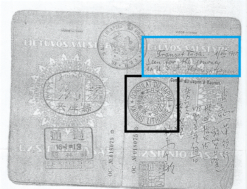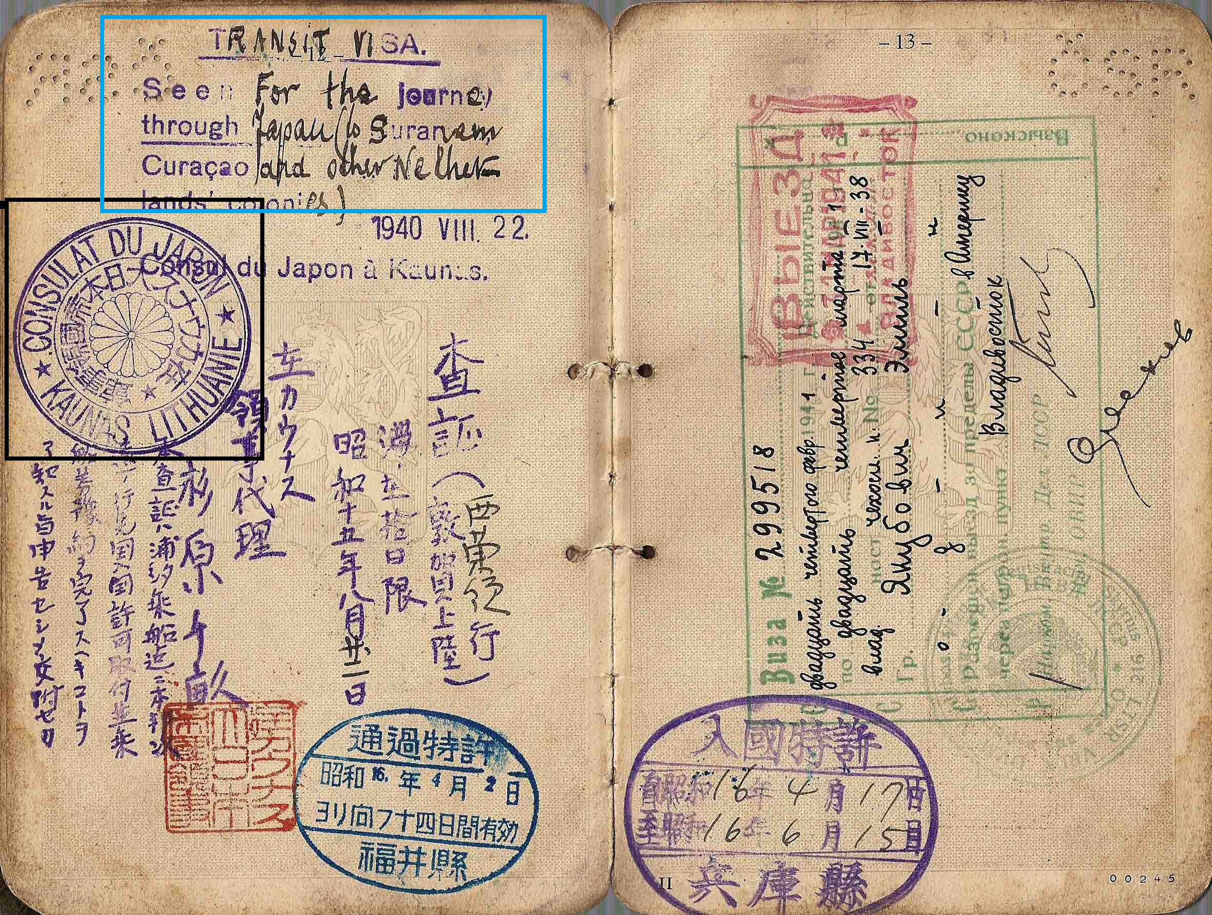 Here is a copy of an official transit visa. Note the stamp in the black box. In the blue box are travel details: via Japan to the Netherlands.